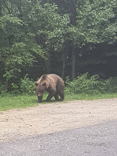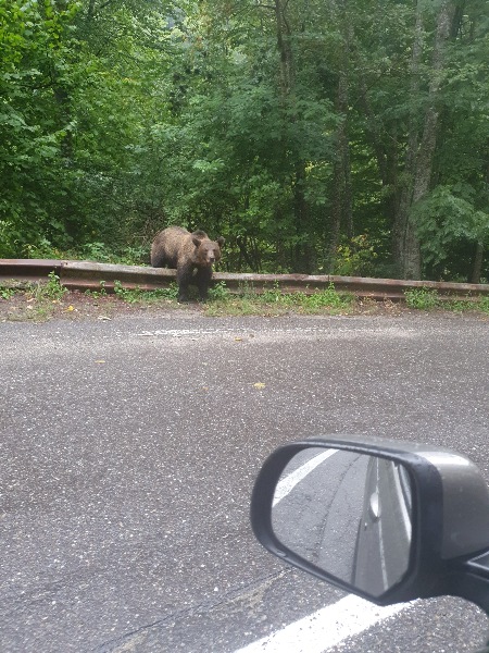 Mein erster Bär in freier Wildbahn, hängt lässig über der Leitplanke und wartet auf Futter. Es gibt halt leider Menschen welche die Tiere füttern und sich dann beschweren wen diese Menschen angreifen. Arm aus dem Fenster mit Futter bedeutet unter Umständen Arm ab.